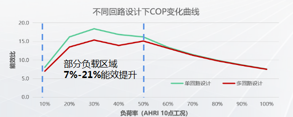 磁懸浮冷水機組采用高效單回路系統(tǒng)設計,較常規(guī)變頻螺桿冷水機組有7%-21%左右的能效提升。